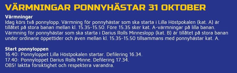 Kl. 15.35-15.50: Endast ponnyvärmningar på stora banan är tillåtet (stora hästar får värma på lilla banan under den tiden)