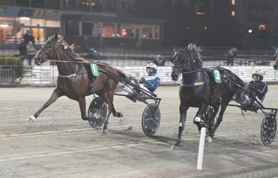 Det var norskt även i det inledande loppet under kvällen. Vinner Lilja (e. Moe Odin) öppnade starkt för ägaren och kusken Trond Möretrö som från dubbla tillägg var med som fjärde ekipage invändigt. 1200 kvar kunde han välja andra utvändigt och via attack i sista sväng fick han greppet sista 100. Segertid 30,1/2180 meter och 50.000 kronor. Diana L Olsson är tränare.