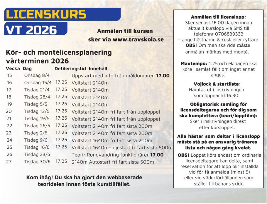 Kör- och Montélicensplaneringen vårterminen 2026. Behöver du kompletteringslopp eller vill du voltträna med din häst går det också bra att vara med. Då kan du vara med i våra kurslopp. Anmäl till 070-683 93 33 före 16.00 dagen innan.