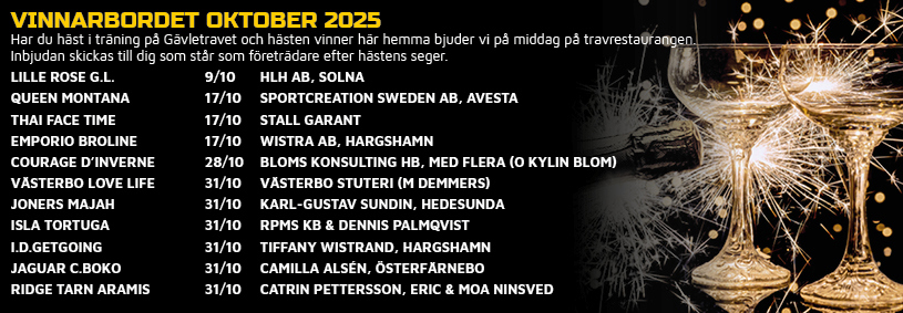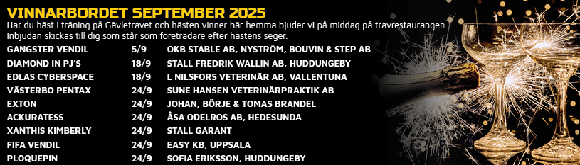 Alla Gävletränade hästar som vinner lopp på hemmaplan under året premieras. Segrande hästs företrädare gratuleras med ett presentkort värt 600 kr på Gävletravets restaurang - Vinnarbordet.